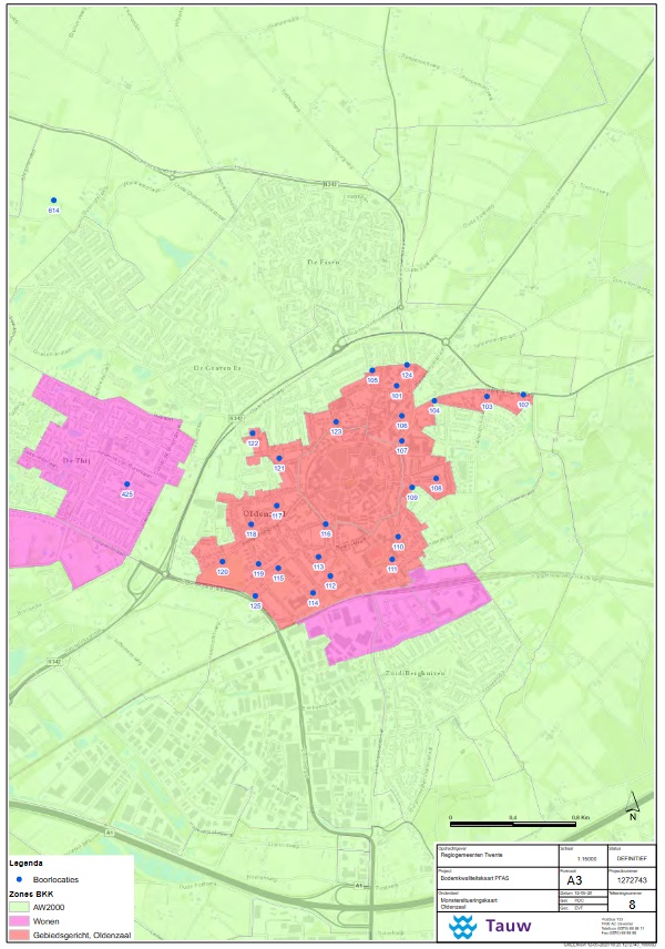 Van de gemeente Almelo waren al wel PFAS-gegevens beschikbaar die conform de eisen voor het opstellen van een bodemkwaliteitskaart zijn verzameld. Voor verdere details verwijzen we naar het separate rapport (Statistische kentallen PFAS - gemeente Almelo. Tauw, kenmerk R001-1272743EVF- V03-rlk-NL, d.d. 6 april 2020). De monsters van Almelo zijn geanalyseerd op 28 PFAS-parameters (advieslijst Bodem+). Verder is er indicatief onderzoek gedaan naar de aanwezigheid van GenX door drie monsters per zone in de bovengrond te analyseren. Hieruit is gebleken dat GenX niet aangetoond is (beneden de rapportagegrens).