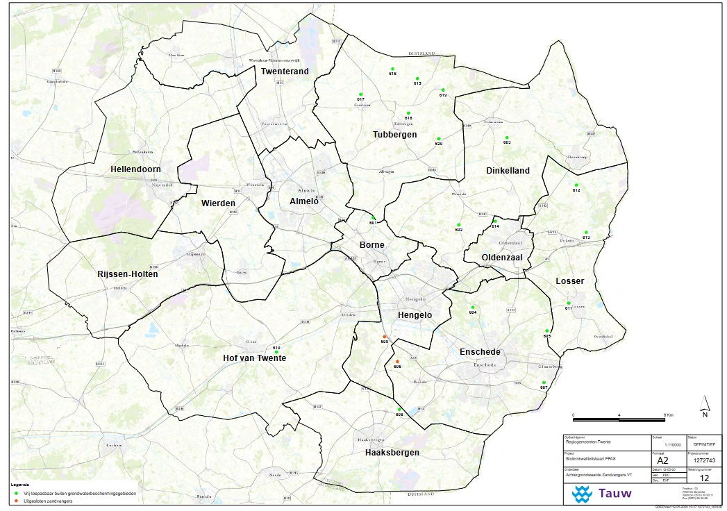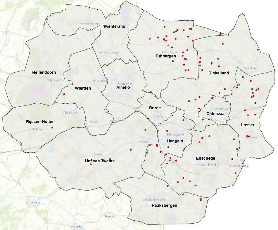 Figuur 3.1 Overzicht beheergebied regio Twente met de gemeentegrenzen en de zandvangers (rode stippen) van het waterschap Vechtstromen (bron: Regionale bodemkwaliteitskaart Twente. Witteveen + Bos, kenmerk ES349-1/18-004.422, datum 23-03-2018)