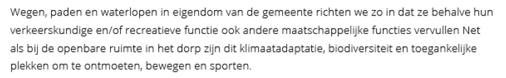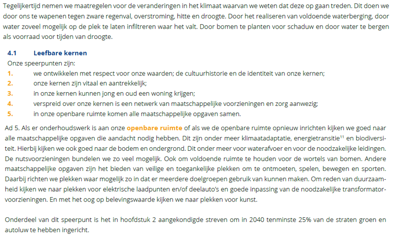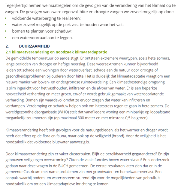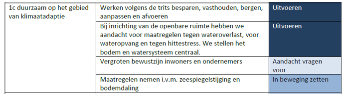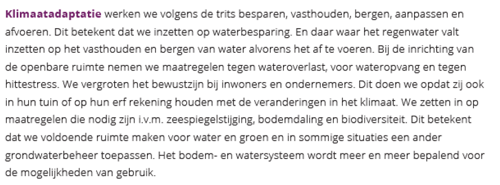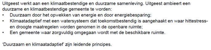 De collegepartijen willen op de al genomen maatregelen een tandje bijzetten. Ten eerste komen we met nieuwe maatregelen om bij te dragen aan de CO2-reductie doelstellingen uit het Klimaatakkoord voor 2050. Ten tweede willen we onze leefomgeving klimaatbestendig maken, zodat we ook in de toekomst voorbereid zijn op bijvoorbeeld korte, maar zeer heftige regenbuien of langere periodes van droogte. Ten derde werken we toe naar een circulaire economie. Daarnaast zijn duurzame bedrijfsvoering en duurzame mobiliteit (dit komt ook terug bij verkeer) onderdeel van het klimaatbeleid.