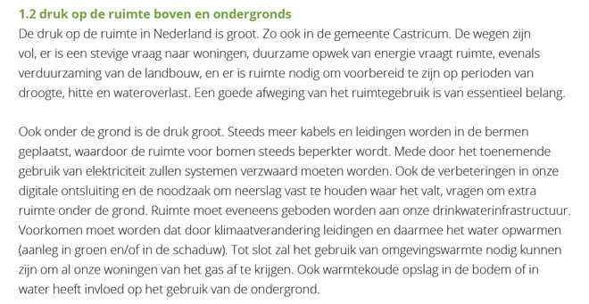 De openbare ruimte verandert. Zo zal met de verandering naar een aardgasloze samenleving een nieuwe ondergrondse energie-infrastructuur ontstaan. Afvalwater wordt bovendien steeds meer leverancier van energie en grondstoffen. Met het ontkoppelen van gasleidingen en de (mogelijke) aanleg van ondergrondse warmwaterleidingen gaat de straat open. Dit biedt kansen om de onder- en bovengrondse infrastructuur kostenefficiënt te vernieuwen en samen meerwaarde te creëren (werk-met-werk maken). Wij erkennen deze efficiëntieslag, maar stellen hierin de randvoorwaarde dat kwaliteit van het huidige ondergronds systeem, zoals het rioleringsstelsel goed in kaart gebracht moet worden. Op deze manier kan er beter gestuurd worden op verbetering en vervanging van onderdelen en de kosten hiervan.