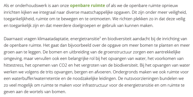 Energietransitie --> vraagt om een nieuwe ruimteverdeling in de straat (bij toepassing van een warmtenet) en ziet mogelijkheden voor aquathermie, warmtewinning uit water. Vanwege het gebruik van oppervlaktewater voor aquathermie is samenwerking met het hoogheemraadschap van belang. Ook is het nodig om vervangingsplanningen af te stemmen om optimaal warmte te kunnen onttrekken uit de aan te leggen systemen.