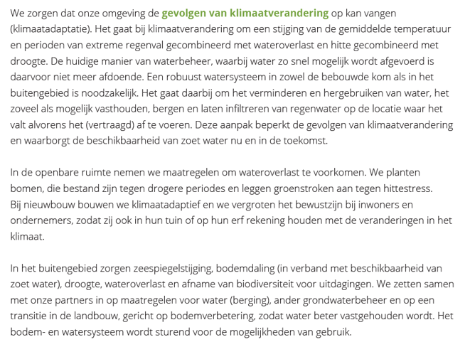 Met het uitvoeren van de watertaken beschermen we de leefomgeving. Bij (her)ontwikkelingen of herinrichting van de openbare ruimte willen we tegelijkertijd samen met bewoners en bedrijven een bijdrage leveren aan een klimaatbestendige en waterrobuuste omgeving, betere waterkwaliteit en ecologie (kaderrichtlijn water), de energietransitie, circulaire economie (levensduurverlenging/hergebruik materialen), versterking van de biodiversiteit en duurzame mobiliteit. De groen gekleurde blokken in dit hoofdstuk zijn bouwstenen voor de omgevingsvisie.