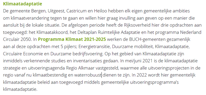 Begin 2023 is het beleidsplan en uitvoeringsprogramma 2023-2026: "Op weg naar klimaatadaptieve en natuurinclusieve gemeenten" voorgelegd aan de raden van de gemeenten Bergen, Uitgeest, Castricum en Heiloo. Hierin hebben de BUCH gemeenten de strategie beschreven hoe we invulling geven aan klimaatadaptatie. Na vaststelling van dit beleidsplan gelden de klimaatbestendige uitgangspunten volgens het MRA basisveiligheidsniveau als werkkader bij (her)inrichtingen en nieuwbouw.