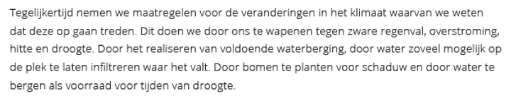 In het landelijke Deltaplan Ruimtelijke Adaptatie (DPRA) is de doelstelling opgenomen dat Nederland in 2050 klimaatbestendig en waterrobuust is ingericht. Alle Nederlandse overheden hebben in 2021 daarom klimaatbestendigheid en waterrobuustheid in hun beleid en handelen moeten verankeren.