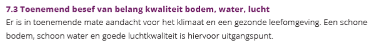 Duurzame mobiliteit --> vraagt om verkeersveiligheid, smallere straten, minder parkeerplaatsen. Biedt kansen voor meer groen en meer ruimte voor infiltratie van regenwater, ook door het gebruik van waterdoorlatende of waterpasserende verharding.