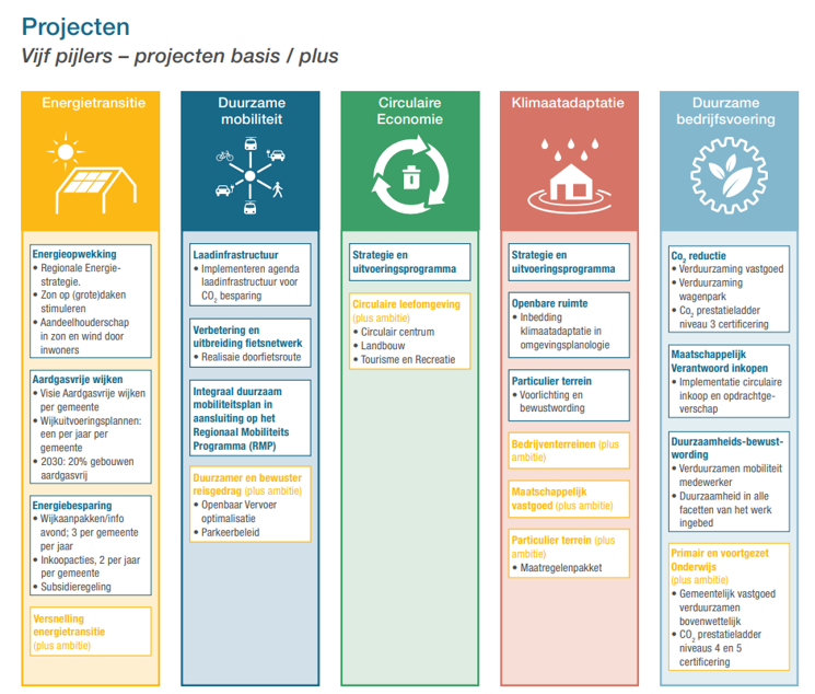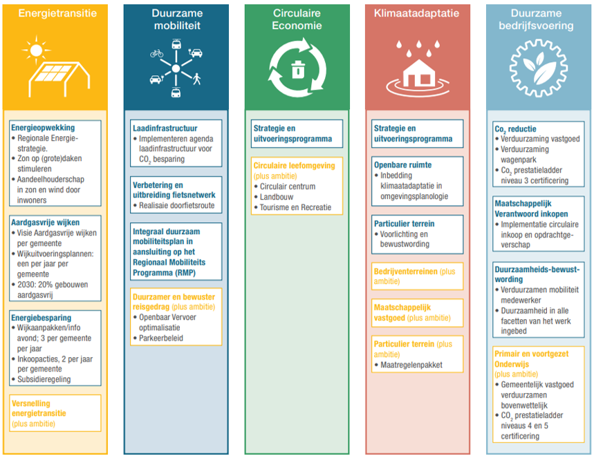 Energietransitie, Duurzame mobiliteit, Klimaatadaptatie, Circulaire Economie en Duurzame bedrijfsvoering. Op het gebied van Klimaatadaptatie zijn inmiddels verkennende studies en inventarisaties gedaan. In 2021-2022 zullen deze verder worden uitgewerkt in een strategie.
