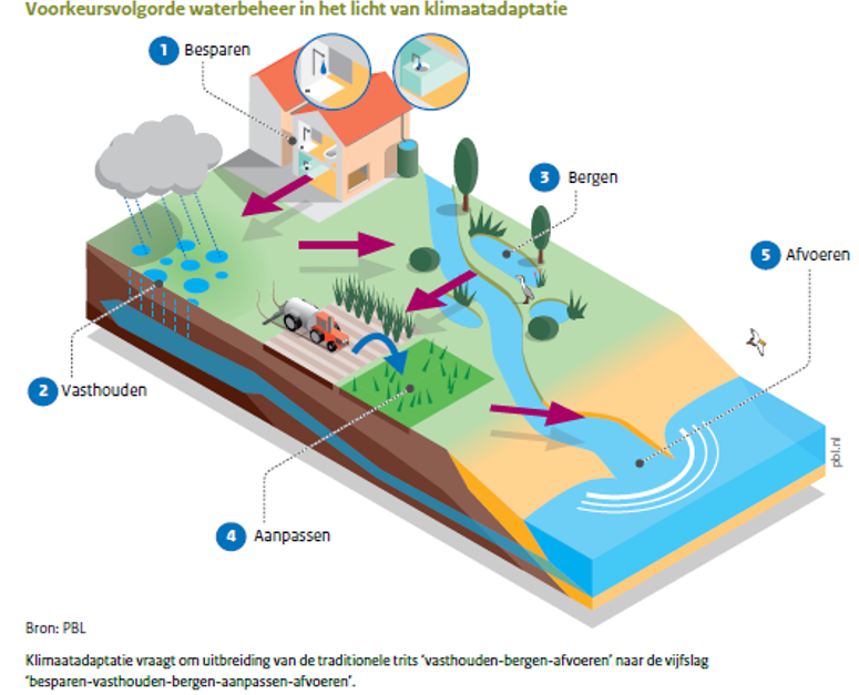Bij de afvoer van al dat water denken we bij het riool vooral aan het ondergrondse buizenstelsel. Tegenwoordig zijn bovengrondse voorzieningen steeds belangrijker bij het verwerken van water en dan vooral hemelwater. Het zal niemand zijn ontgaan dat als gevolg van klimaatverandering de weersomstandigheden extremer zijn geworden. Na hoosbuien kan het rioolstelsel het water niet altijd snel verwerken. We kunnen ons tegen het overtollige water proberen te wapenen met beton en kostbare buizen, maar dat is op de lange duur niet voldoende. Daarom treffen we voorzieningen in de openbare ruimte om tijdelijk grote hoeveelheden regenwater op te vangen en gedoseerd af te voeren naar het oppervlaktewater (sloten, vaarten), de ondergrond of een andere plek in de buitenruimte waar het geen overlast veroorzaakt. De volgorde waarin wij bij voorkeur omgaan met hemelwater is: benutten van water voor gebruik en droge gronden, vasthouden van water, tijdelijk bergen van water en vervolgens afvoeren naar oppervlaktewater.