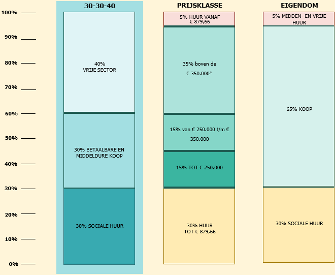 We volgen in onze woonvisie de doelstellingen zoals ze gesteld zijn in het coalitieakkoord ‘Samen bouwen aan vertrouwen’. Dit betekent inzetten op verdeling van: 30% sociale huur, 30% betaalbaar tot middeldure koop en 40% vrije sector. Zo zetten we in op het creëren van een evenwichtige woningvoorraad voor alle doelgroepen, maar maken we ontwikkelingen ook niet onhaalbaar.