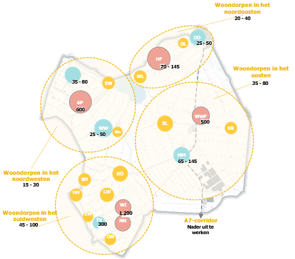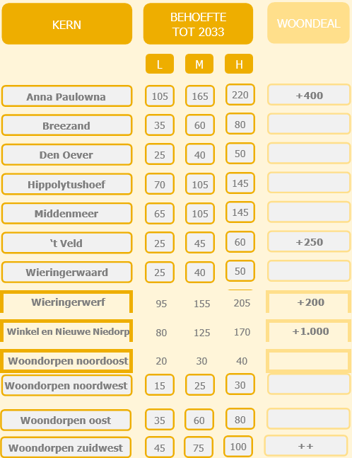 De groei van de afgelopen jaren zet de komende tijd door. Gelet op ontwikkelrisico’s moeten daar zo’n 1.800 plannen tegenover staan. De meeste vraag is weggelegd voor Anna Paulowna, Wieringerwerf, Winkel-Nieuwe Niedorp, Hippolytushoef en Middenmeer. Specifiek in Winkel-Nieuwe Niedorp, Anna Paulowna, ‘t Veld en Wieringerwerf zijn plussen denkbaar vanuit de Woondeal. Daar zijn direct locaties voorhanden.