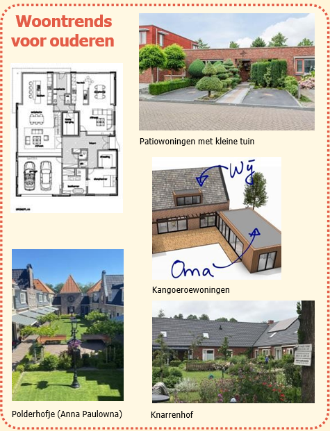 Niet elke woning is geschikt om aan te passen en zorg in te ontvangen. Daarnaast is er, ook om eenzaamheid tegen te gaan, behoefte aan meer gemeenschappelijke woonvormen die geschikt zijn voor het ontvangen van zorg. Dit zijn woonvormen die we nog te weinig hebben, bleek ook uit de online vragenlijst. Zo zijn er drie duidelijke woonbehoefte volgens de online vragenlijst te onderscheiden: