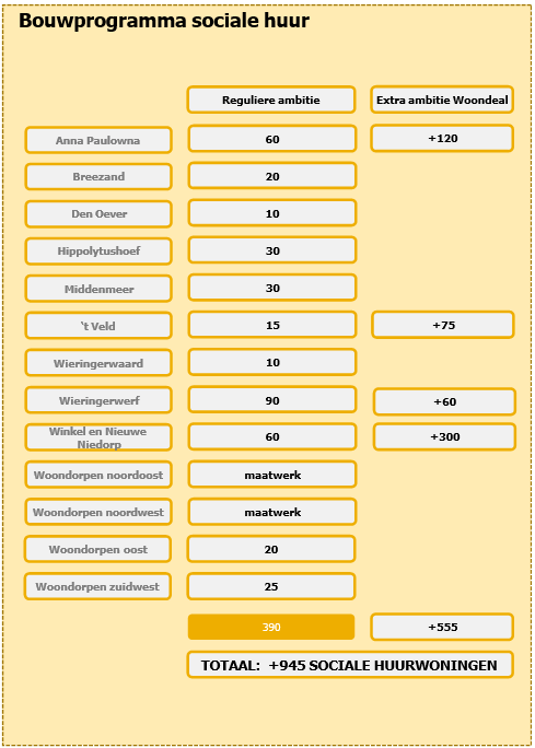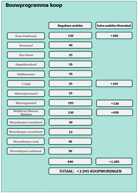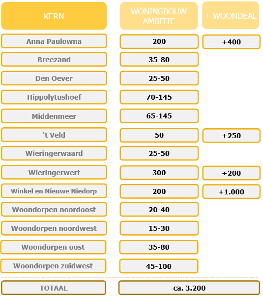 De gemeenten in de regio Noord-Holland Noord bouwen tussen 2022 en 2030 samen minimaal 40.000 nieuwe woningen. Daarvan komen er 7.400 in de Kop van Noord- Holland en een substantieel deel hiervan in Hollands Kroon. Dat staat in de Woondeal die tussen de regio en het Rijk gesloten is. Het gaat om een bruto opgave, dus los van sloop en onttrekking. In Hollands Kroon zijn netto 1.350 woningen nodig, uitgaande van het hoogste scenario uit het woonbehoefteonderzoek dat begin 2023 is uitgevoerd. In de Woondeal zijn voor Hollands Kroon zes versnellingslocaties aangewezen, waar extra tempo maken mogelijk is. Dat zijn: randweg in Anna Paulowna, fase 2 en 3 in ‘t Veld, Dahliapark en Limmerschouw in Winkel, Ooster- en Westerweg in Nieuwe Niedorp, Oosterterp in Wieringerwerf.