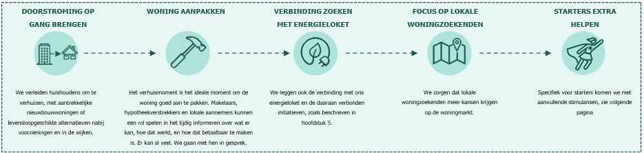 We gaan bij nieuwbouw eisen stellen aan de zorggeschiktheid van woningen. Zo willen we in elke kern inzetten op het toevoegen van hofwoningen of appartementen met ruimte voor samenkomst. Eventueel kunnen hier geschikte woningen voor senioren gecombineerd worden met betaalbare woningen voor starters die bereid zijn een maatschappelijke bijdrage te leveren.