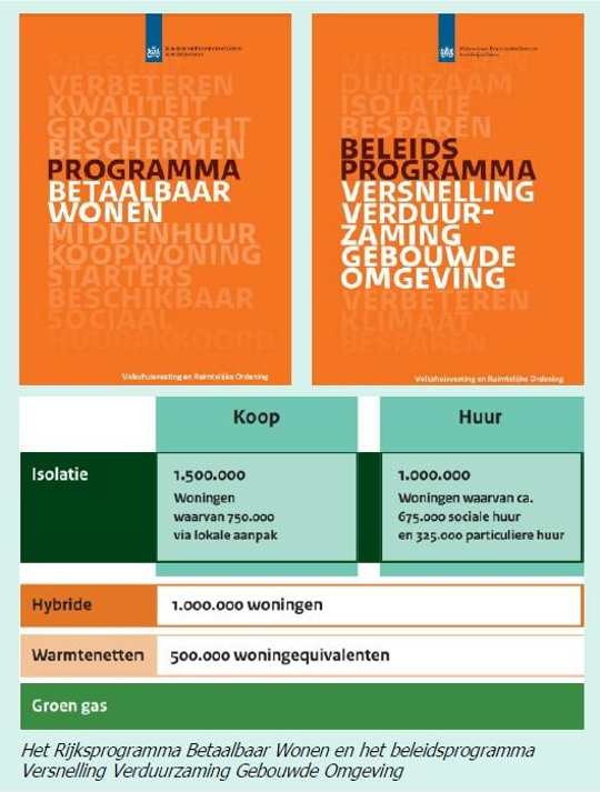 Het ministerie van BZK presenteerde in 2022 de Nationale Woon- en Bouwagenda. Daaronder vallen de programma’s Betaalbaar Wonen en Verduurzaming Gebouwde Omgeving. Doelen zijn CO₂-reductie en betaalbaar wonen, door isolatie, installaties, warmtenetten en groen gas. Het Rijk ziet een individuele aanpak en een gebiedsgerichte.