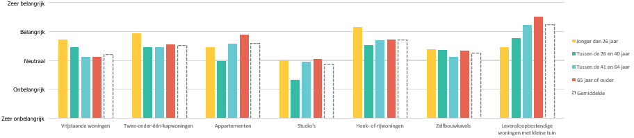 Aansluitend bij de behoefte aan betaalbare koopwoningen door jongeren/starters en de behoefte aan sociale huurwoningen door senioren springen appartementen, hoek- of rijwoningen en levensloopbestendige woningen met een kleine tuin er bovenuit. Toch komen de meeste woningtypen er als ‘neutraal’ uit. Dit komt vooral door de grote verscheidenheid aan wensen. Sommigen vinden het bouwen van vrijstaande woningen helemaal niet belangrijk, terwijl anderen dit juist als ontbrekend product zien. Zo vindt toch zeker 15% van de ondervraagden zelfbouwkavels ‘zeer belangrijk’. Er lijkt dus een substantiële vraag naar te zijn. Deze vraag bestaat ook voor uit senioren die samen met anderen graag een “gezellige derde helft” willen ontwerpen en realiseren.