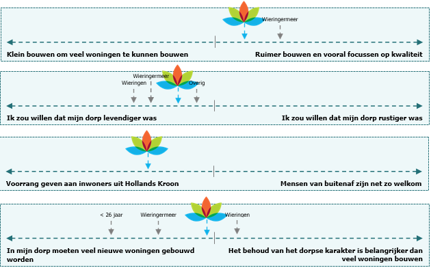 De uitkomsten van de stellingen in de enquête laten een genuanceerd beeld zien. Er is een behoefte aan ruime woningen met veel kwaliteit, maar ook veel kleine woningen zijn niet onbelangrijk. Vooral Wieringen en Wieringermeer verschillen i.v.m. het westen van de gemeente.