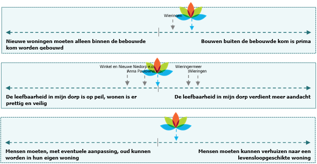 Inwoners zijn verdeeld over het bijbouwen langs de randen van dorpen, wat het karakter van dorpen kan schaden. Zo vindt men over het algemeen het dorpse karakter net zo belangrijk als het toevoegen van meer woningen. Inwoners onder de 26 vinden het toevoegen van meer woningen in hun dorp wel veel belangrijker dan het behoud van het karakter. Hier speelt uiteraard mee dat zij vaak nog geen woning hebben.