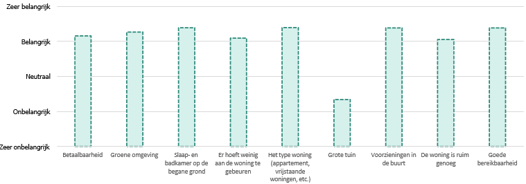 Iets meer dan een derde van de senioren (65+) in Hollands Kroon is van plan om te verhuizen. Dit kan binnen twee jaar zijn, maar ook pas over vijf of meer jaar. Kijken we naar de woonwensen van deze specifieke groep (de groene balken in de onderstaande grafiek), dan valt op dat ouderen eigenlijk alle woonwensen belangrijk vinden behalve het hebben van een grote tuin. Het inzetten op een geschikt product voor senioren lijkt dan ook in eerste instantie lastig. Toch zijn er drie duidelijke producten te onderscheiden: