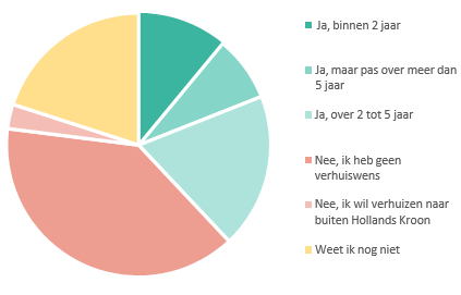 Aan alle woningtypes is behoefte in Hollands Kroon blijkt uit de vragenlijst. Dit zijn behoeften vanuit verschillende leeftijdsgroepen. Toch valt op dat de levensloopbestendige woningen de boventoon voeren. Dit past ook bij de vergrijzing van Hollands Kroon. Daarnaast werd ook aangegeven dat er behoefte is aan kavels.