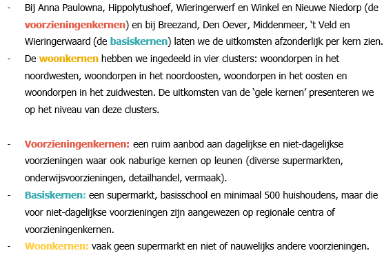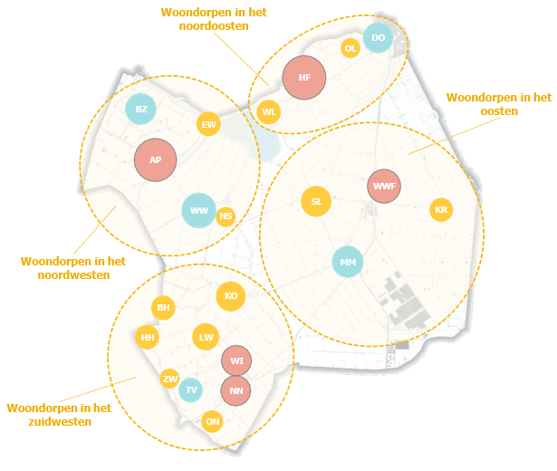 De kaart hiernaast laat de gemeente Hollands Kroon zien met alle kernen daarbinnen. De woningbouwambitie laten we soms op kernniveau zien en soms naar clusters van kernen. Dat doen we volgens de gebiedsindeling op de kaart: