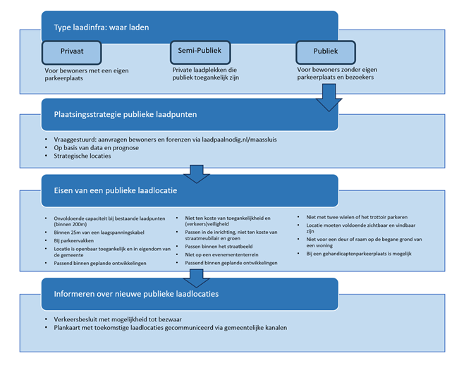 De gemeente Maassluis stelt een verkeersbesluit op. Tegen het verkeersbesluit kan een bezwaar worden aangemaakt. Op basis van de plankaart zal gebruik worden gemaakt van verzamelverkeersbesluiten. Hierin staan locaties in een wijk die worden aangewezen om als laadlocatie in gebruik te kunnen worden genomen. Daarnaast worden er losse verkeersbesluiten genomen voor aanvragen waar geen geschikte locatie op de plankaart voor kan worden gevonden.