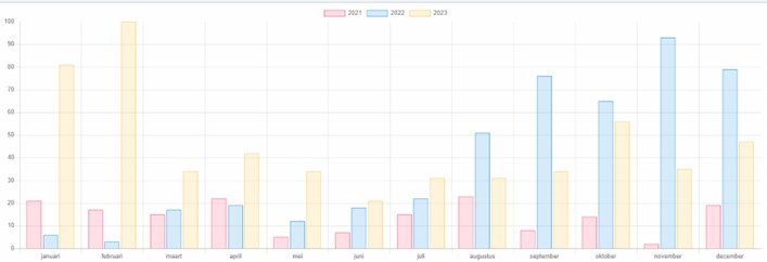 Hieronder ziet u de verdeling van deze constateringen over de afgelopen drie jaar per maand.