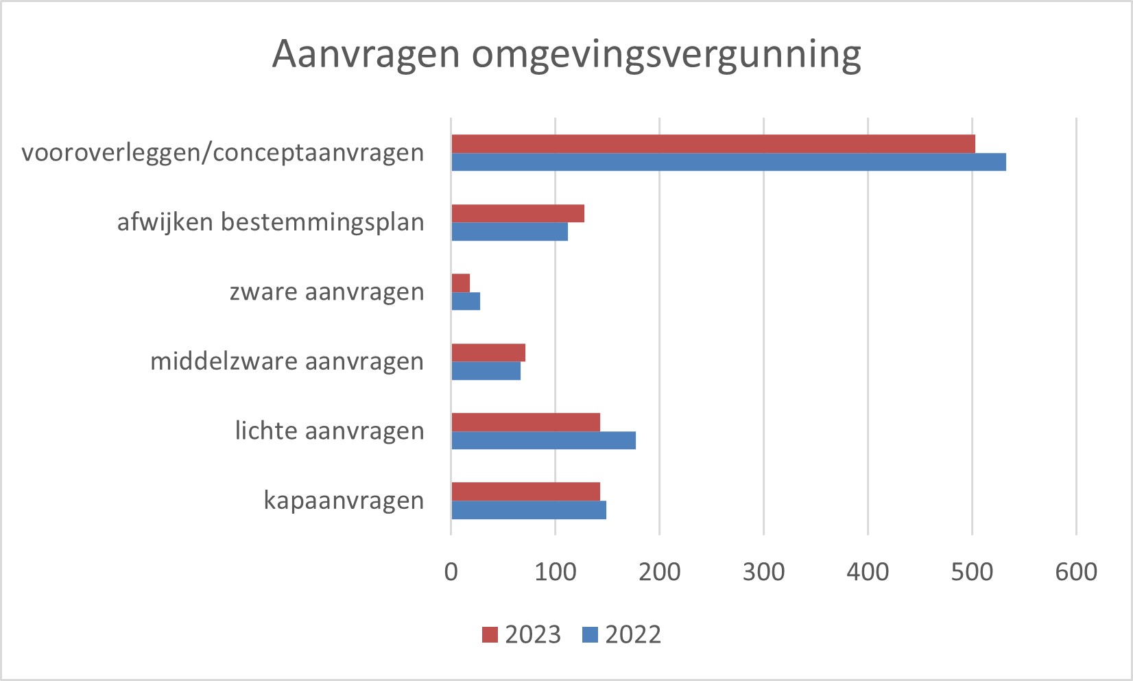 Er is een kleine afname te zien in het aantal verleende vergunningen terwijl de hoeveel aanvragen grotendeels gelijk is gebleven. Mogelijke oorzaak is dat er veel aanvragen aan het einde van het jaar zijn ingediend. Vermoedelijk vanwege de komst van de Omgevingswet op 1 januari 2024. Dit heeft invloed gehad op de doorlooptijden van aanvragen aan het einde van het jaar.