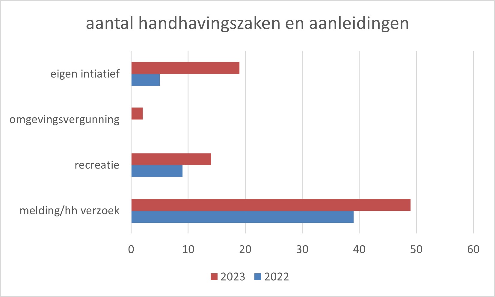 In 2022 is het aantal handhavingszaken dat wordt gestart naar aanleiding van een melding of handhavingsverzoek groot. Dit heeft tot gevolg dat er minder ruimte is voor om zaken op te pakken vanuit actieve opsporing (eigen initiatief) of een programmatische aanpak, gebaseerd op de prioriteiten.