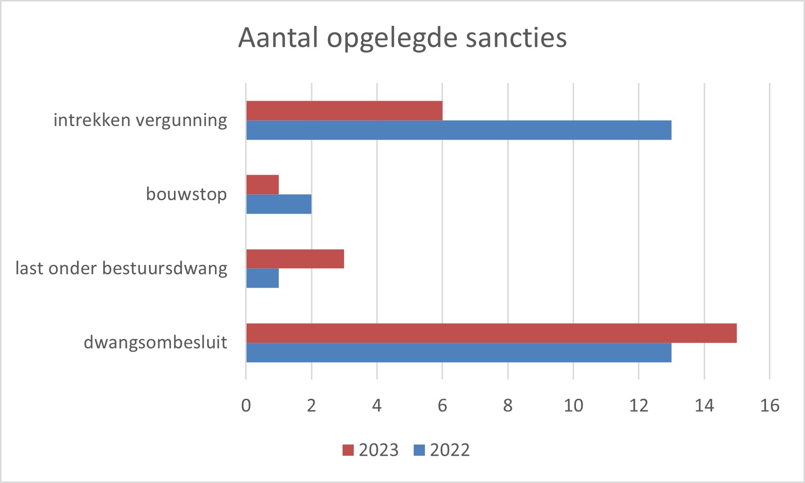 Vanwege de opschoonactie in 2022 zijn er in 2023 minder vergunningen ingetrokken. In 2023 is vaker een last onder bestuursdwang opgelegd voor gevallen waar een last onder dwangsom niet de geschikte sanctie is. In 2023 is geen bestuursdwang van gemeentewege uitgevoerd.