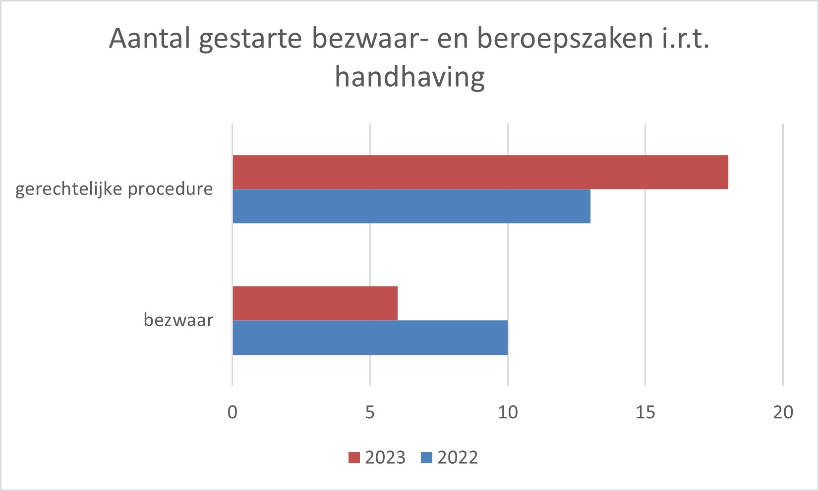 In 2022 is het aantal nieuwe zaken in bezwaar en beroep in 2022 relatief hoog in verhouding tot de opgelegde sancties. In 2022 zijn er nog veel zaken uit voorgaande jaren in procedure bij de rechtbank en de Raad van State (gerechtelijke procedures), dat zijn er 25. In 2022 houdt een groot deel van de lopende procedures verband met eerder genoemde hardnekkige casuïstiek, het gaat om 16 procedures. Een voorbeeld daarvan is de kwestie rondom het Landgoed Tongeren. Door de complexiteit en verwevenheid van deze procedures vragen deze extra inzet.