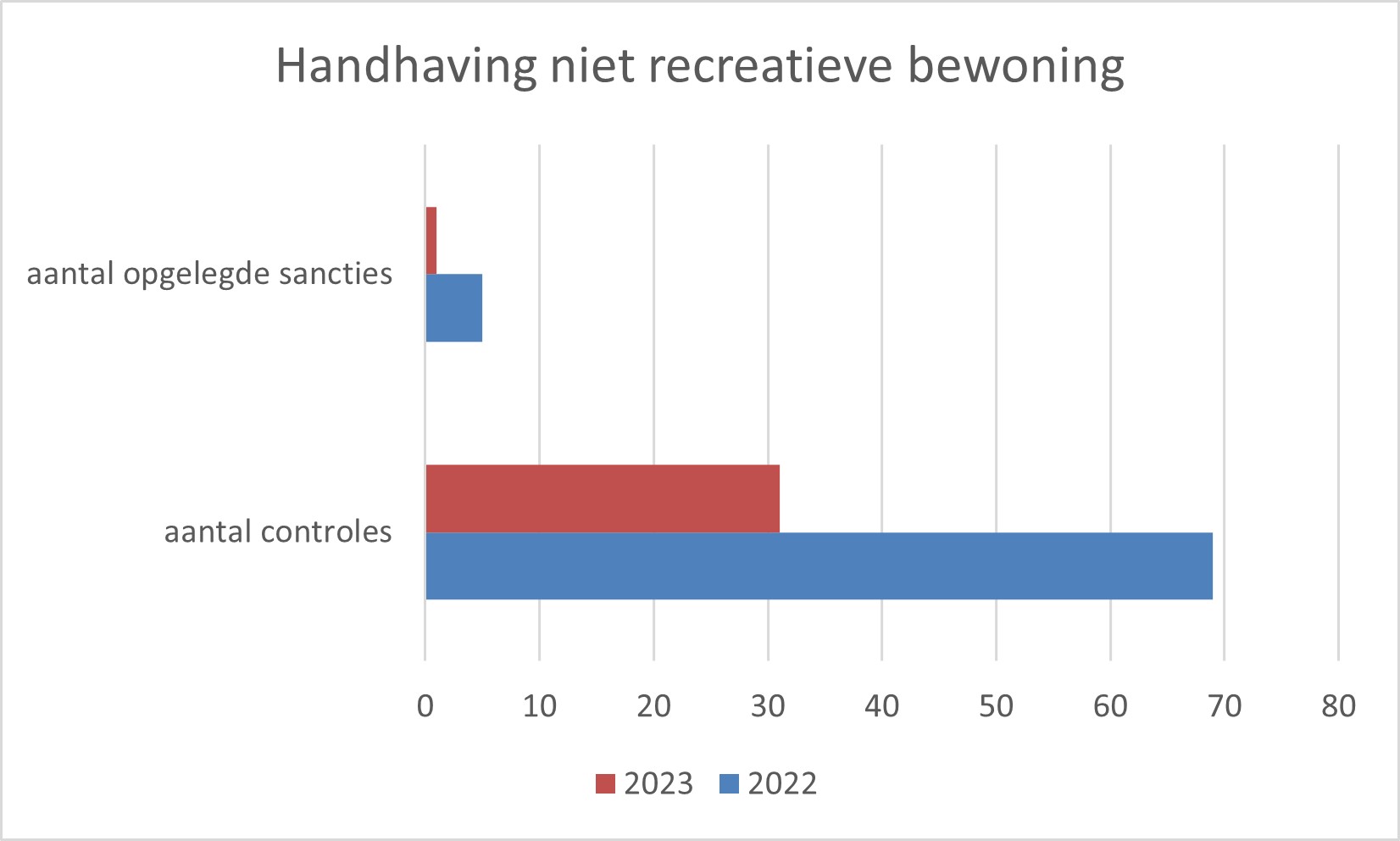 Hoewel het aantal handhavingsprocedures tegen niet-recreatieve bewoning van recreatiewoningen is toegenomen, zijn er in 2023 minder sanctie opgelegd dan in 2022. In 2023 heeft er op één van de parken een handhavingsactie plaatsgevonden, waarbij meerdere overtredingen zijn vastgesteld. In het voorstadium is geïnvesteerd in informatieverstrekking en voorlichting. Daarom zijn de meeste overtredingen zonder handhavingsbesluit beëindigd.