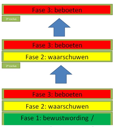 Een praktijkvoorbeeld is de verkeersveiligheid bij scholen. Om het gedrag van directie, leerkrachten, ouders en verzorgers te beïnvloeden is het wenselijk om te kiezen voor een projectmatige benadering. Met gebruik van een bewustwordingscampagne wordt ingezet op fase 1. Door middel van het delen van informatie van de gemeente, maar ook van de scholen, wordt ingespeeld op het gedrag rondom de verkeersveiligheid bij scholen. De handhavers plannen verschillende diensten om bij de scholen te waarschuwen. De resultaten van deze controles worden gecommuniceerd via de reguliere kanalen van de gemeente. Zodra de resultaten inzichtelijk zijn gemaakt, wordt ook duidelijk hoe groot het verkeersprobleem is. Op een later moment wordt met dezelfde frequentie gecontroleerd bij scholen, waarbij het uitgangspunt is dat bij een overtreding direct wordt gesanctioneerd. Aan het einde van deze projectgerichte benadering, waarbij de verwachting is dat een bepaald effect zichtbaar is, worden de resultaten gecommuniceerd via de reguliere kanalen van de gemeente. Door de resultaten te communiceren worden lezers op de hoogte gesteld dat de gemeente handhavend optreedt tegen zulke overtredingen, in de hoop dat hier voortaan rekening mee wordt gehouden.