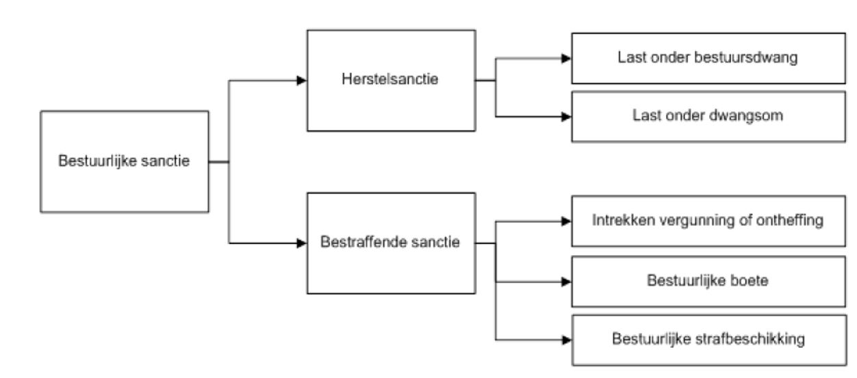 Wat in relatie tot de overtreding een passende bestuurlijke sanctie is, is afhankelijk van de situatie. Bij een herstelsanctie gaat het om het geheel of gedeeltelijk ongedaan maken van een overtreding of het wegnemen of beperken van de gevolgen van een overtreding. Bij de bestraffende sanctie gaat het om het toevoegen van leed c.q. straf aan de overtreder. In het volgende schema is het palet aan bestuurlijke sancties weergegeven.