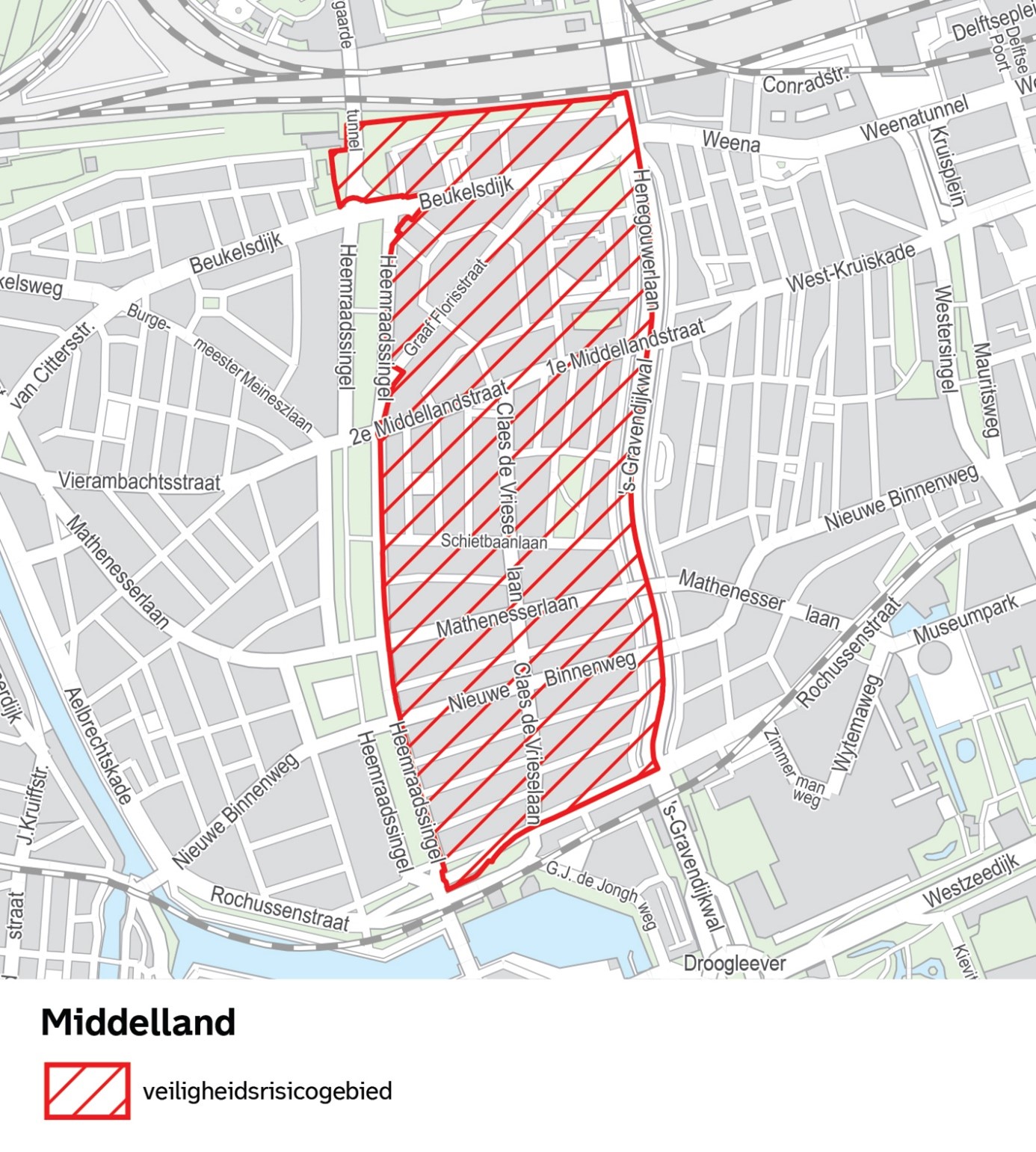 Op grond van artikel 2:76 van de Algemene plaatselijke verordening Rotterdam 2012 wordt het gebied Centrum, zoals aangegeven op de kaarten in bijlage 1, met inbegrip van de daarin gelegen voor het publiek openstaande gebouwen en daarbij behorende erven, wegen, oevers en aanwezige knooppunten van het openbaar vervoer, aangewezen als veiligheidsrisicogebied.