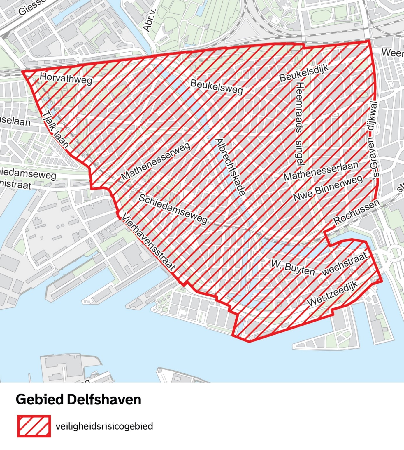Op grond van artikel 2:76 van de Algemene plaatselijke verordening Rotterdam 2012 wordt het gebied Delfshaven, zoals aangegeven op de kaarten in bijlage 2, met inbegrip van de daarin gelegen voor het publiek openstaande gebouwen en daarbij behorende erven, wegen, oevers en aanwezige knooppunten van het openbaar vervoer, aangewezen als veiligheidsrisicogebied.