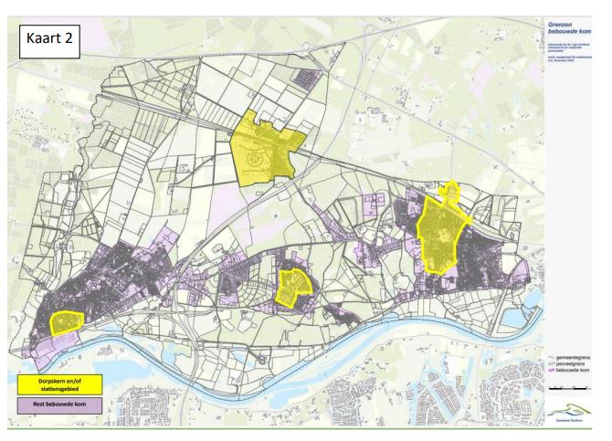 Dorpskerngebieden zijn bepaald op basis van loopafstand ten opzichte van een concentratie van voorzieningen waarbij voor de gebieden met een station een afstand is aangehouden met een wandelduur van gemiddeld 15 minuten. Voor de kernen zonder station is tussen de 7 à 10 minuten aangehouden.