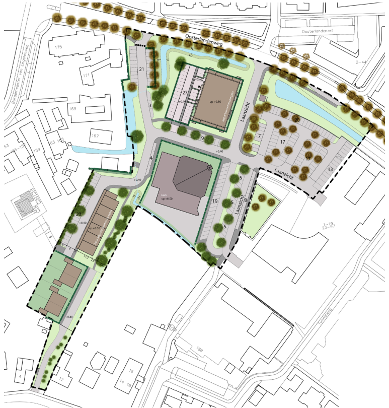 Van oost naar west wordt er langs de Oosterlandenweg een samenhangend beeld nagestreefd. Het bestaande profiel van de Oosterlandenweg met een watergang en door- gaande bomenrij wordt gehandhaafd, waarbij het water aan de westzijde in het gebied wordt verbonden met een bestaande watergang aan de achterzijde van percelen aan de Burgemeester van Engelenweg. Het bestaande parkeerterrein aan de westzijde van het gebied wordt samen met de bestaande bomen ingepast in het stedenbouwkundige plan. Dit bestaande parkeerterrein wordt vanuit het gebied zelf ontsloten, voetgangers kunnen vanaf de Oosterlandenweg via dit parkeerterrein het gebied in. Zo ontstaat er voor langzaam verkeer ook een tweede verbinding tussen Oosterlandenweg en Oosterholtseweg (naast het al aanwezige pad langs het zwembad).