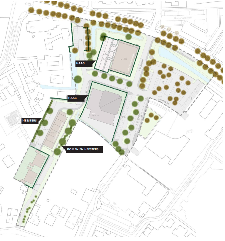 Het appartementengebouw in het noordelijke deel en de kerk worden waar mogelijk door middel van een haag langs de erfgrens omzoomd. Ook de tuinen van de twee-onder-één kapwoningen worden waar deze grenzen aan de openbare ruimte begrensd door een haag. Uitgangspunt is daarnaast ook om de overgangen tussen de bestaande tuinen en de openbare ruimte zoveel mogelijk met groen / heesters vorm te geven.