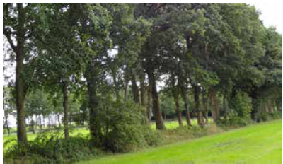 De hoofdweg grenst aan de oostzijde aan de wetering met een groene grasberm. De weg wordt hier begeleid door een laanbomen beplanting. Het beeld is hier enigszins gedifferentieerd, door de toepassing van 3 a 4 soorten en een wat wisselende plantafstand. Zo wordt de laan wat minder formeel, statig en meer natuurlijk en passend in een dorpsrand. De hoofdweg ontmoet het bestaande dorp bij de Brink.