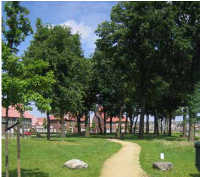Op de groene plekken komt een aantal grote dorpsbomen. Ze hebben de ruimte, dus worden het een soort groene ankerpunten van de buurt. Dorpsbomen zijn: lindes, iepen, eiken en kastanjes. In het inrichtingsplan gaan we t.z.t. verder in op welke soorten of cv’s (qua standplaats, ziektegevoeligheid, combi met waterberging e.d.) uiteindelijk passen. Wat kleinere soorten worden geplant in de parkeerkoffers. Deze bomen moeten schaduw geven, maar geen overlast in de vorm van vruchten, druip, wortelopdruk etc.
