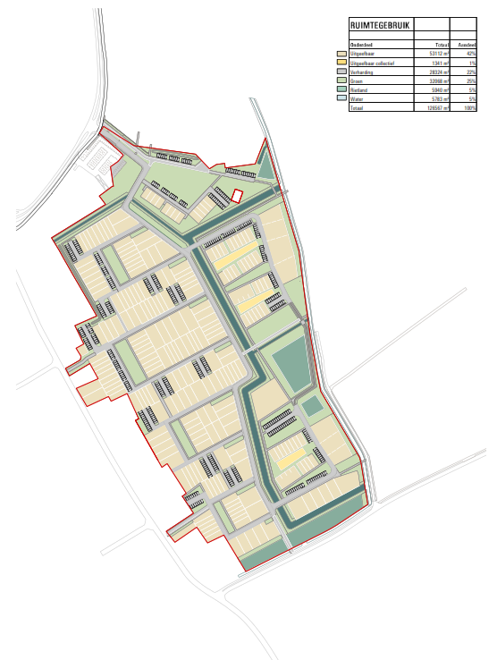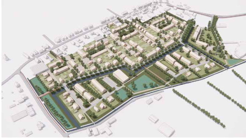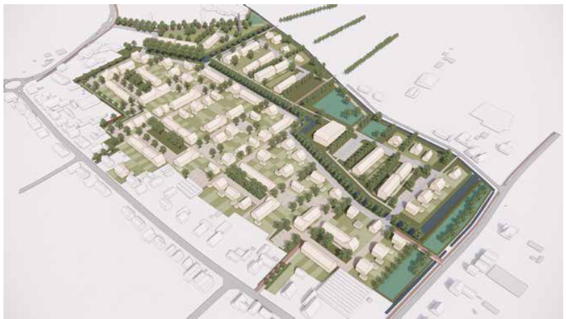 De ‘ruggengraat’ van het plan is een ruime groen- blauwe zone met de hoofdontsluiting, een brede watergang en voorkanten van woningen.