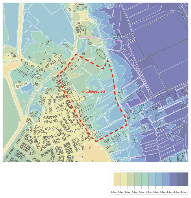 Het hoogteverschil tussen de Plasweg en de oostkant van het plangebied is circa 3 meter. Ongeveer halverwege dit hoogteverschil loopt het niveau van 0 meter NAP. Deze lijn is in het ruimtelijk concept ingezet als scheiding tussen een westelijke gelegen plandeel ‘Erf’ en een lager gelegen plandeel ‘Veld’. De nullijn vormt als het ware de ‘ruggengraat’ van de wijk met de hoofdontsluiting en een brede watergang (de wetering) begeleid door bomen.