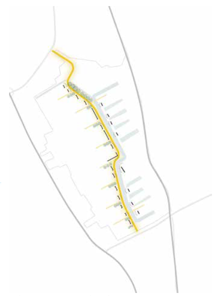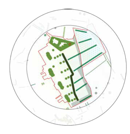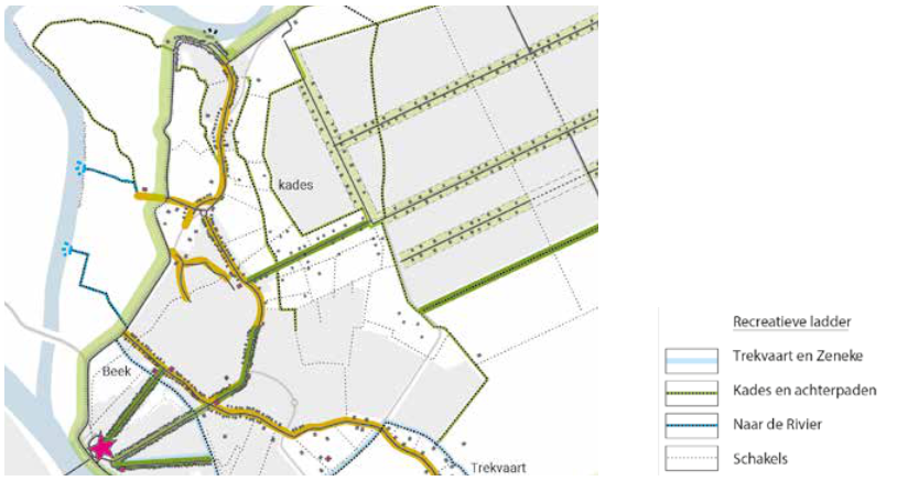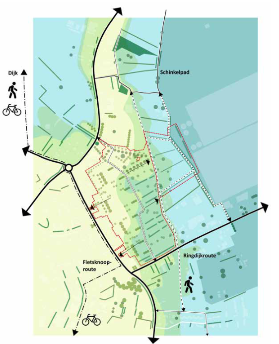 In de Gebiedsvisie Dorpsrand IJsselmuiden (pag. 82) wordt voorgesteld ‘de landschappelijke lijnen op te pakken, te herstellen en te continueren tot een recrea- tieve structuur. Het worden de achterpaden van het dorp waar je rustig, direct vanuit de woonomgeving kunt wandelen, fietsen of paardrijden. Voor een klein ommetje in de buurt of om verder het landschap in te gaan. De achterpaden worden met kleine dwarspaadjes, de schakels, verbonden met de structuurdragers zodat er een ladderstructuur ontstaat. Aan de structuurdragers wordt gewoond, gewerkt en rijden de auto’s. De achterpaden zijn er alleen voor langzaam- en bestemmingsverkeer; ze vormen de rustige, ontspannen en wat rafelige kant van het dorpslandschap.’ Concreet worden deze aanbevelingen gevolgd en gaan ervan uit dat de Ringdijk en het Schinkelpad als nieuwe routes zullen bijdragen aan de recreatieve infrastructuur in de oostelijke dorpsrand. In De Bakkerij zelf komen de schakels, de dwarspaadjes die onderdeel uitmaken van de interne langzaam verkeerstructuur.