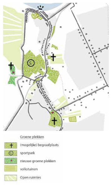 Verderop (pag. 88) wordt in de Gebiedsvisie de ambitie uitgesproken ‘...de open en groene plekken te handhaven en meer aandacht en betekenis te geven bij de dorpsontwikkeling. (. . .) Er wordt bij elke ontwikkeling gezocht naar mogelijkheden om er lucht in te houden. Soms door wat compacter te bouwen aan open plekken, soms door wat losser of wat verder van de dorpsrand af te gaan. De dorpsrand wordt zo niet steeds iets opgeschoven, maar dorps- en landschapsontwikkeling gaan gelijk op. Naast de handhaving van de bestaande markante open ruimtes en groene plekken, wordt voorgesteld ook een aantal nieuwe groene plekken te ontwikkelen die het uitgelegde dorp kunnen gaan dragen. Daarbij zijn op de Raamwerkkaart een aantal belangrijke open ruimtes en zichtlijnen vastgelegd, die belangrijk zijn voor de luchtigheid van het dorp en de relatie met het omliggende landschap.’
