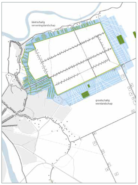 Het oorspronkelijke slotenpatroon komt terug in ritmische stroken groene ruimtes afgewisseld met rijtjeswoningen. De strokenstructuur wordt nog versterkt doordat alleen de bebouwde delen worden opgehoogd voor voldoende drooglegging. Delen van het Veld blijven zo op huidig maaiveld liggen, waardoor de landelijke sfeer behouden blijft. De houtwallen worden begeleid door greppels die voor regenwaterafvoer zorgen. De houtwallen bestaan uit een mix van inheemse soorten, els, es, veldesdoorn, meidoorn, kers, vlier e.d. De open veldjes worden afwisselend ingezet als collectieve tuin, waterberging en speelveld, ook in combinatie met elkaar.