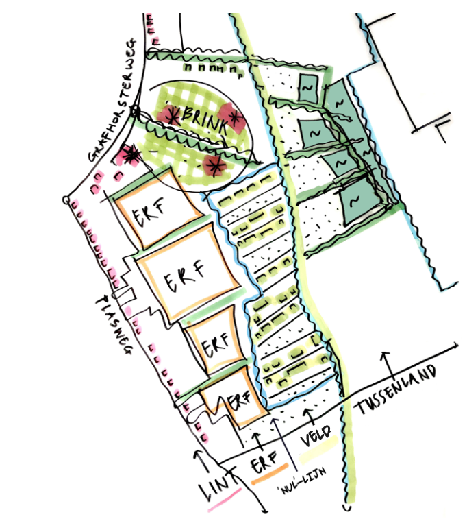 Naast het Erf en het Veld ligt bij de hoofdentree van de wijk, vanaf de Grafhorsterweg, een derde plandeel. Deze bestaande open groene plek, deels omzoomd door flinke houtwallen en boomgroepen, wordt in het plan benut als groene entree van de wijk. Eén ruimtelijk ontwerp met een vrij te gebruiken weide, grote bomen en wandelpaden. Een Brink waar, naast een aantal bestaande functies (de tennisvereniging, een hondenclub, de supermarkt en een middelbare school), woonfuncties worden toegevoegd. Zo ontstaat een herkenbaar entreegebied met ruimte voor verblijven en verschillende activiteiten. Een vierde plandeel is de zone met vrijstaande woningen langs de Ringdijk als overgang tussen het Veld en de lager gelegen polder.