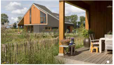Individuele uitstraling van woningen met sterke hoofdvorm, buitenruimte geïntegreerd in of bij woning, lage goot, natuurlijke uitstraling met hout als basismateriaal