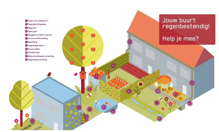 Het is belangrijk om de hier beschreven thema’s in de gebiedspromotie mee te nemen. Het belang van minder verharding in de tuinen en een inrichting met verschillende soorten bloemen, planten en bomen moet ook aan bewoners worden uitgelegd. Ook kan er gestimuleerd worden in de tuin een regenton te plaatsen. In bijvoorbeeld een gebiedsbrochure kan informatie worden verstrekt over de principes en onderhoud van de openbare ruimte, zoals de halfopen verharding en kruidenrijke grasbermen.