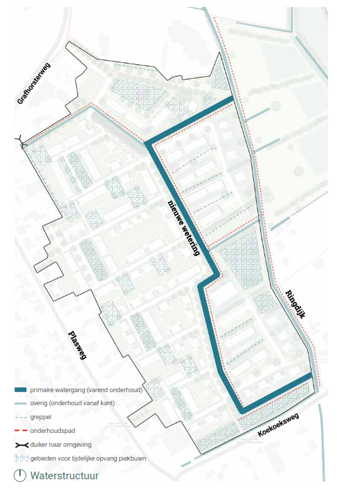 In het hoofdstuk stedenbouwkundig plan wordt in de paragraaf over water beschreven hoe de waterstructuur in elkaar zit, het watersysteem werkt en hoe aan de bergingsopgave wordt voldaan. Voor het voorkomen van wateroverlast en droogte zijn de volgende klimaatadaptieve maatregelen genomen: