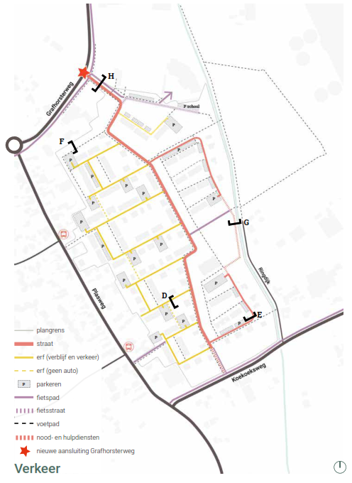 De hoofdontsluiting heeft een eigen identiteit. De verharding heeft vanaf de aansluiting op de Grafhorsterweg tot aan de Koekoeksweg een zelfde materiaal, dus ook het laatste fietsgedeelte. De 2 structuurdragers in het bestaande dorp worden hierdoor met de nieuwe verbonden. In een grijs-bruin-kleurige klinkersteen markeert de weg de overgang van de zand naar veen ondergrond. De donkere steen aan de waterzijde, de lichte steen als trottoir aan de hogere zijde en overgang naar deelplan het Erf.