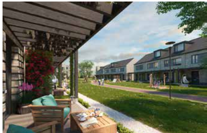 Bij de hoofdentree tot de wijk komen verschillende functies samen rond een groene open ruimte, de Brink. De bebouwing heeft een stevige maat en schaal en omarmt de plek.